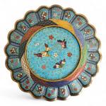 Japon, période Meiji (1868-1912) Coupe floriforme en émaux cloisonnés sur cuivre à décor en médaillons de motifs géométriques, papillons et fleurs. D. 21,5 cm