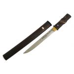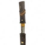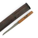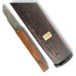Koshirae en laque marron, à l'imitation du bois, la poignée ornée d'un grand mille-pattes en relief, d'une cigale et d'une sauterelle. Le fourreau, avec une signature Shôzan dans un cartouche. Avec kogatana à lame signée et kozuka en suaka et shakudo, figurant un serpent traversant.