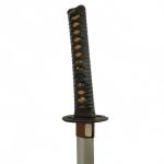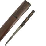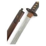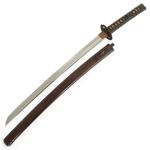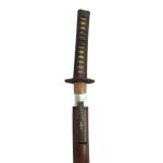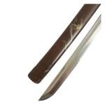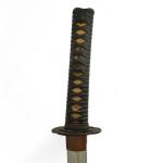 Katana à lame en shinogi-zukuri, non démonté ; koshirae avec fourreau en laque brune à décor appliqué d'un dragon en argent et cuivre doré sur fond aventurine, poignée lacée sur same ; avec kogatana, tsuba en fer, menuki. Le kozuka à décor de chevaux.