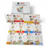 Coffret ASTERIX 2022 comprenant 9 pièces de 10 euros, certaines colorisées, le sens de la fête, humour, invincibilité, voyage, partage, irrévérence, irréductibilité, snesibilité, hospitalité, et 2 pièces de 50 euros amour et succès