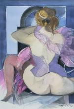 Camille HILAIRE (1916-2004) Dans les coulisses n°3 Aquarelle signée en bas à droite, titrée et signée au dos du montage 49.5 x 35 cm à vue