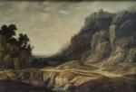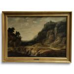 dans le goût de Jacob VAN DER CROOS [hollandais] (c.1635-c.1700) Paysage de montagne, cascade Huile sur panneau 59.5 x 84.5 cm (restaurations anciennes)