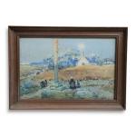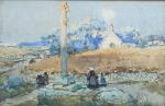 ECOLE BRETONNE du XXème Personnages au pied du calvaire Aquarelle signée en bas à gauche 19.5 x 30 cm à vue (petites piqûres)