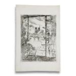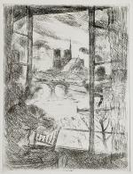 René LEVREL (1900-1981) Paris, la femme de l'artiste devant Notre Dame et la Seine Estampe avec cachet de la signature au dos 29 x 19.5 cm Provenance: - Famille de l'artiste