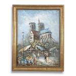 BURNETT (XXème) Paris, le marché au fleurs au dos de Notre Dame Huile sur toile signée en bas à droite 41.5 x 31 cm