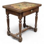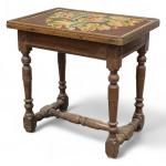 TABLE en bois naturel, le plateau orné d'une tapisserie