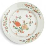 CHINE Compagnie des Indes Assiette ronde en porcelaine à décor famille rose de fleurs XVIIIème D.: 22.8 cm (fêle, légères ébréchures)