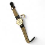 Boitier rond, lunette lisse, couronne cannelée ornée d'une pierre bleue, fond à vis, signé.