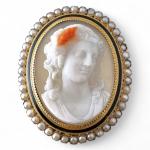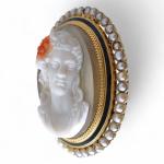 Elément de BROCHE centrée d'un camée calcédoine agate figurant un visage feminin sculpté insérée dans une monture d'or jaune soulignée d'un rang de perles probablement fines et émail noir.