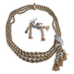 DEMI-PARURE en or deux tons 750/°° agrémentée de petits diamants, composée d'un collier trois rangs maille torsadée, une broche amovible pouvant se fixer au collier, et une paire de boucle d'oreille. Dans son écrin.