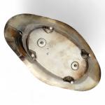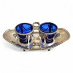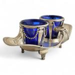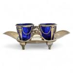 H.: 10 cm L.: 28.5 cm l.: 15.5 cm Poids: 669 gr (on y joint deux verrines en verre bleu avec égrenures)