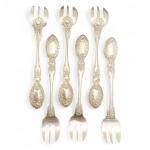 Suite de six FOURCHETTES A HUITRES en argent, modèle feuillagé Orfèvre: JG L.: 12.5 cm Poids: 134 gr