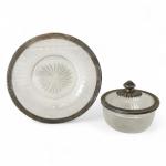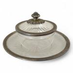 BEURRIER couvert et son dormant en cristal et argent Minerve. Orfèvre: Henri LAPEYRE (1895-1923) H.: 9.5 cm D.: 17.8 cm Poids brut: 470 gr