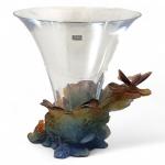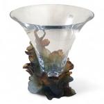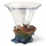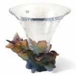 DAUM France Vase en cristal, la base en pâte de verre à décor d'un papillon sur des feuilles, signé H.: 30.2 cm (dans sa boite d'origine à la forme)