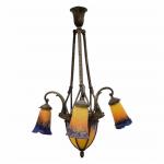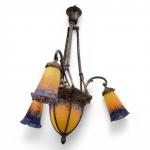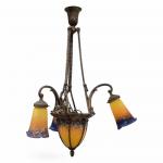 MULLER Frères à Lunéville Suspension en bronze à trois bras de lumière, les cache ampoule de forme tulipe et la vasque en verre marmoréen, signée Années 1910-20 H.: 80 cm
