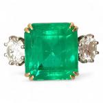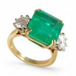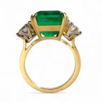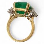 BAGUE en or jaune 750/1000e ornée au centre d'une émeraude rectangulaire à pans coupés pesant 11.05 ct entre deux diamants ronds de taille brillant