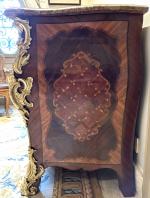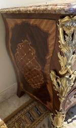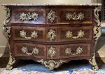 COMMODE tombeau galbée en façade et sur les côtés, ouvrant à cinq tiroirs, en placage et marqueterie de satiné et amarante, en treillage dans un cartouche sur les côtés, estampillée I.C.SAUNIER et poinçon de jurande JME, ornementation de bronzes dorés, dessus de marbre brèche d'Alep