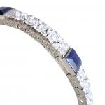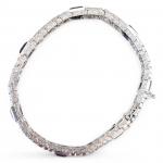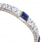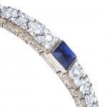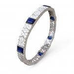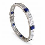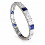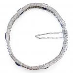 Bracelet articulé en platine 850 millièmes entièrement pavé de diamants ronds de taille brillant ou de taille ancienne alternés de sept saphirs rectangulaires légèrement en chute.