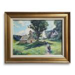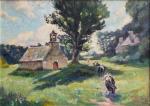 J. ROULLEAU (XXème) Les vaches devant la chapelle, 1960. Huile sur toile signée et datée en bas à droite 33 x 46 cm