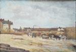 ECOLE FRANCAISE début XXème Paysage au bord de la rivière près du pont Huile sur toile 38 x 55 cm