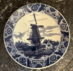 DELFT Plat rond en faïence à décor bleu blanc d'un moulin D.: 39 cm