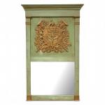 TRUMEAU en bois mouluré rechampi et redoré à décor d'un trophée avec cornes d'abondance, surmontant un miroir