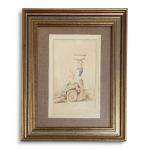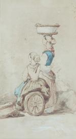Emile LOUBON (1809-1863) Deux paysannes Aquarelle signée " E.Loubon " en bas à droite 16,8 x 9,4 cm (insolé) Expert: cabinet de Bayser