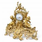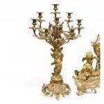 GARNITURE DE CHEMINEE en bronze doré à décor rocaille de putti, angelots, feuillage, fleurs, comprenant une pendule et une paire de candélabres à huit bras de lumière, le cadran émaillé