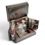 CAVE A LIQUEURS en bois noirci et filet de laiton, comprenant un réassort de trois carafes et treize verres différents