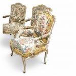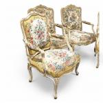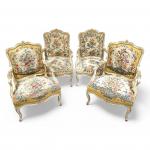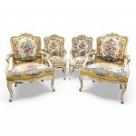 Suite de quatre FAUTEUILS à dossier plat dit à la Reine, en bois sculpté, mouluré, rechampi et doré, à décor de feuillage et fleurs, estampillés N. BLANCHARD