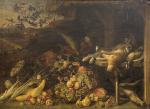 attribué à Pieter VAN BOUCLE (vers 1610-1673) Nature morte au lièvre, perdreau, légumes et fruits sur fond de paysage Toile 119 x 164 cm Expert: cabinet Turquin