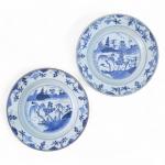 CHINE Paire d'assiettes rondes en porcelaine à décor bleu blanc de paysages XVIIIème D.: 22.7 cm (fêle et égrenures)