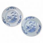 CHINE Paire d'assiettes rondes en porcelaine à décor bleu blanc de fleurs XVIIIème D.: 22.8 cm (légères égrenures)