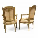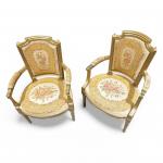 Deux FAUTEUILS en bois sculpté, mouluré et redoré, les montants à cannelures, le dossier à chapeau de gendarme Epoque Louis XVI