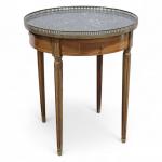 TABLE BOUILLOTTE en acajou sculpté et mouluré, ouvrant à deux tiroirs et deux tablettes en ceinture, dessus de marbre à galerie Style Louis XVI H.: 73 cm D.: 63 cm (accident au marbre)