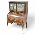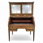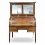 BUREAU CYLINDRE en acajou et placage d'acajou ouvrant à quatre tiroirs en ceinture surmontés d'un cylindre dégageant un intérieur compartimenté, la partie haute ouvrant à deux portes foncées de glace, les pieds cannelés et rudentés, estampillé C.M. LECLERC, dessus de marbre à galerie