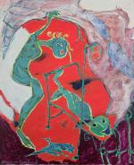 Geneviève ROUBAUD (1946-2024) Elle le regarde dans sa mort Acrylique sur toile signée en bas à gauche, titrée, datée 1995 et contresignée au revers 81 x 67 cm