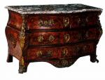 COMMODE de forme tombeau, en placage de bois de violette ouvrant à quatre tiroirs sur trois rangs très belle garniture en bronze ciselé et doré, dessus marbre brèche