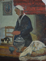 Maraichine au chat dans un intérieur vendéen Gouache sur papier cartonné signée en bas à gauche